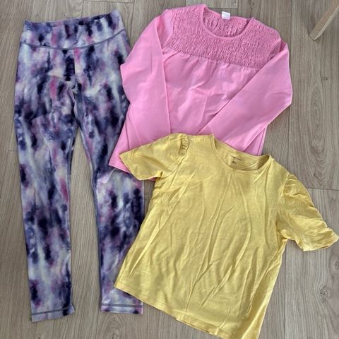 Tyttöjen vaatteet koossa 146, kaikki ostettu H&M. Sisältää siistimmän paidan, kaksi arkisempaa paitaa ja shortsihaalarin.