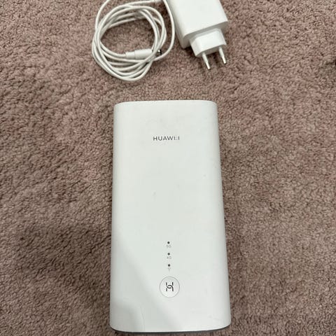 Huawei 5G-reititin B715s-23c. Sisältää virtalähteen ja kaksi antennia. Käytetään langattoman verkon jakamiseen kotona tai toimistossa.