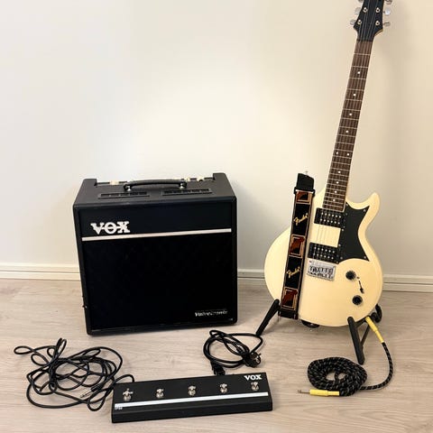 Ibanez sähkökitarat valkoisella rungolla ja punaisella otelaudalla. Kitara on varustettu mustilla mikrofoneilla ja säädöillä. Mukana Rocktron vahvistin, jossa kaksi kaiutinta ja useita säätimiä äänen hallintaan. Vahvistin vähän nähnyt elämää mutta toimiva ja kitaran kielet semi vanhat jo. Vain nouto en pysty lähettämään. Hinnasta voi vähän tingata.