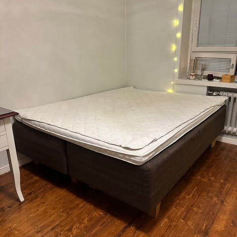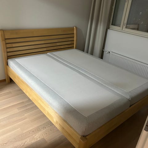 Myydään 160 cm leveä parisänky, jonka päädyssä on valo. Sängyssä on vaneripohja, joka on toisessa kuvassa nostettu pois, jotta sängyn alarakenne näkyy. Sänky on jämäkkä eikä natise.