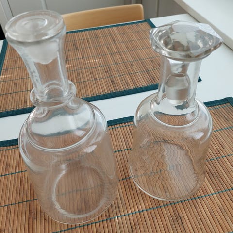 Myydään kaksi varsin vanhaa lasipulloa, korkeus 15 cm. Pohjaleiman perusteella voisi olla venäläistä alkuperää, tilavuus 2 dl.