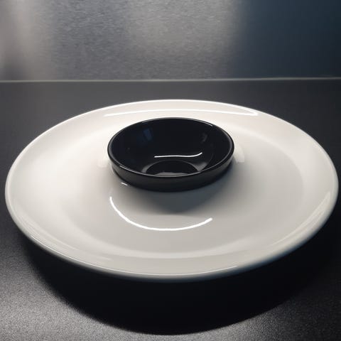 Myydään uudenveroinen valkoinen Arabian Roma tarjoilulautanen, jossa on keskellä vihreä dippikulho. Vadin halkaisija on 32 cm.