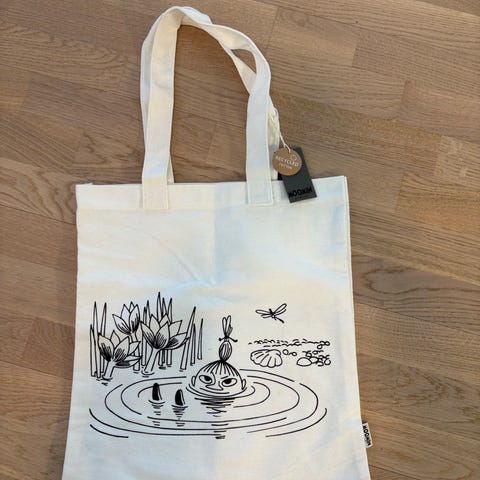 Harmaa Muumi-kassi. Kangas jämäkkää ja farkkumaista. Mitat enimmillään noin 33 x 36 cm. Sisätaskun vetoketju ei pysy kunnolla kiinni, muuten kunto ok.