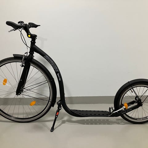 Myynnissä hyväkuntoinen Kickbike. Rungon maalipinnassa kulumajälkiä ja seisontatuki irronnut.