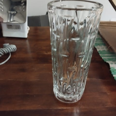 Kirkaslasinen iso pyöreä maljakko tai kulho. Korkeus noin 15,5 cm ja halkaisija suuaukolta noin 13,5 cm. Ehjä ja siisti.
