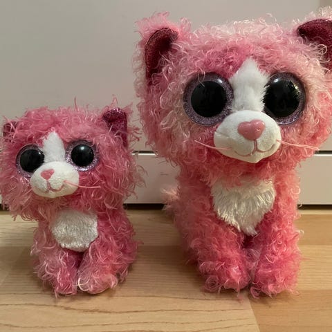 Leikeissä mukana ollut Ty kissa pehmo, keskikokoista kokoa. Kunto leikitty siisti, ei mainittavaa vikaa. Lähitarkastelussa vähän käytön jälkeä.