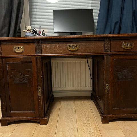 Tässä on aito 1900-luvun alun antiikkinen kirjoituspöytä, joka huokuu aikaa, laatua ja käsityötaitoa. Massiivipuinen runko ja nahkainen kirjoituspinta tekevät pöydästä sekä käytännöllisen että poikkeuksellisen tyylikkään – tämän äärellä työskentely tuntuu erityiseltä.