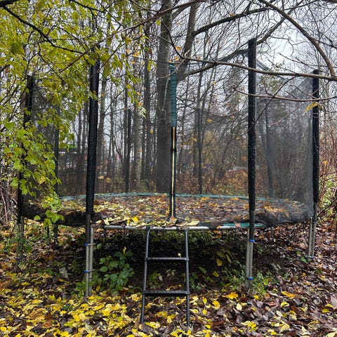 Annetaan trampoliini, runko ja jouset ehjät ja toimivat. Hyppykangas repeytynyt. Annetaan koko setti pois, ei pelkkiä osa noutoja. Tramppa purettu kuvassa purku päällä. Mukaan mm. Tolpat ja verkko. Hyppykankaan lev 288cm, pit 422cm, jousen pit n.24 cm.
