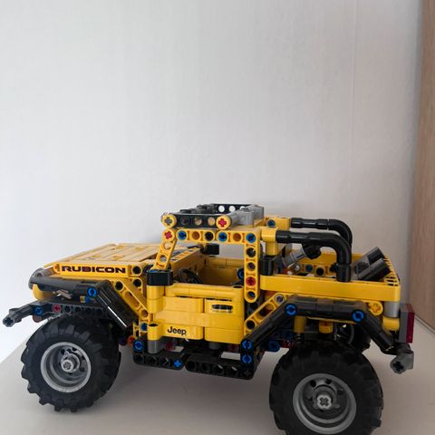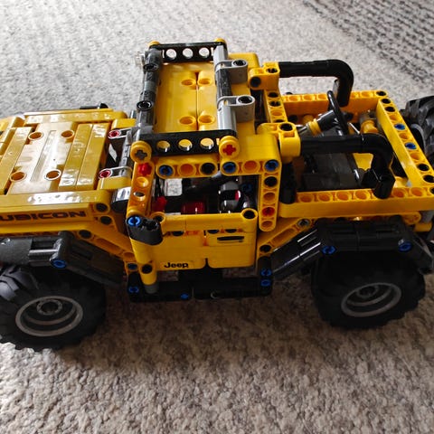 LEGO Technic Jeep rakennussarja, joka sisältää keltaisen maastoauton mallin. Kaikki osat tallessa.
