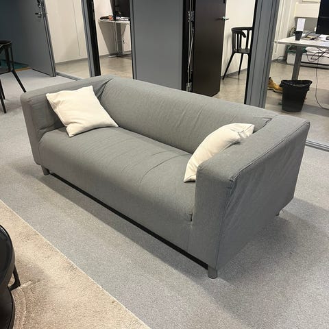 Ikean Klippan sohva, kahden hengen. Sohvan päällinen likainen ja värjäytynyt, joten näyttää epäsiistiltä. Uudella päällisellä saisi hyvän sohvan. Päällisiä myynnissä ainakin Ikeassa. https://www.ikea.com/fi/fi/p/klippan-paeaellinen-2-n-istuttavaan-sohvaan-tingetorp-keltainen-valkoinen-kukkakuvio-90600272/
