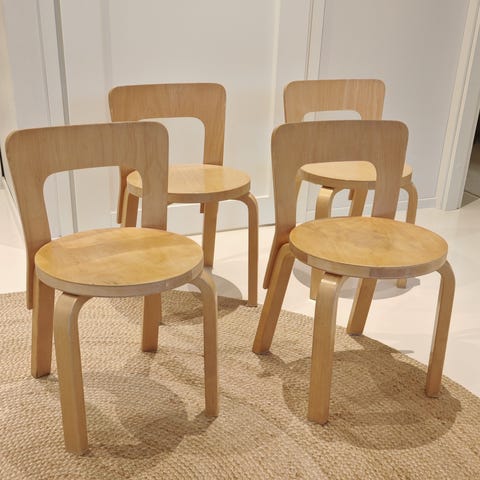 Myydään kaksi Artek 65 tuolia. Istuinkorkeus on 44cm. Molemmat tuolit vaativat kunnostusta, toisen tuolin selkänojan pinnassa lohkeama. Hinta per tuoli.
