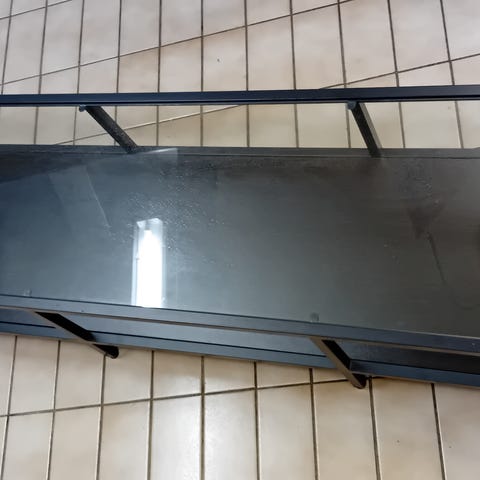 Valkoinen pöydän lasikansi. Pyöristetyt kulmat.