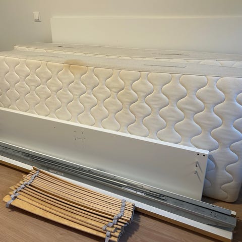 There is a Ikea bed frame (same size) can be given for 40€ with them. It is currently wrapped, so it’s not possible for a full picture.