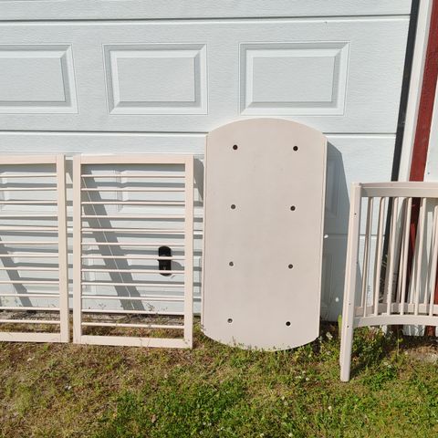 Valkoinen, kiiltäväpintainen vauvan sänky laskettevalla etureunalla. Lukittavat pyörät. Vähäisiä käytön jälkiä. Yksi putkien vastakappale puuttuu, jotta etureunan saa laskettua, kuvassa. Vain nouto.