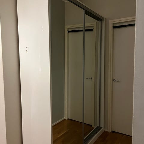 Vaatekaappi peiliovella. Sisällä hyllyt, laatikot, ja vaatetanko.