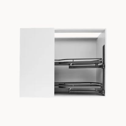 Beslag Design Nova -karuselli keittiön kulmakaappiin. Tämä pyörivä keittiömekanismi mahdollistaa kattiloiden ja pannujen helpon säilyttämisen. Helppo asentaa kaapin pohjaan. Irrotettavat hyllyt. Halkaisija 820 mm.