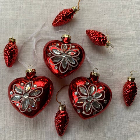 Lasisia joulukuusen koristeita (Huom! Sydämet jo myyty). Osaa ei ole kertaakaan pidetty kuusessa, osaa vain kerran. Hinta 5€ per rasia.