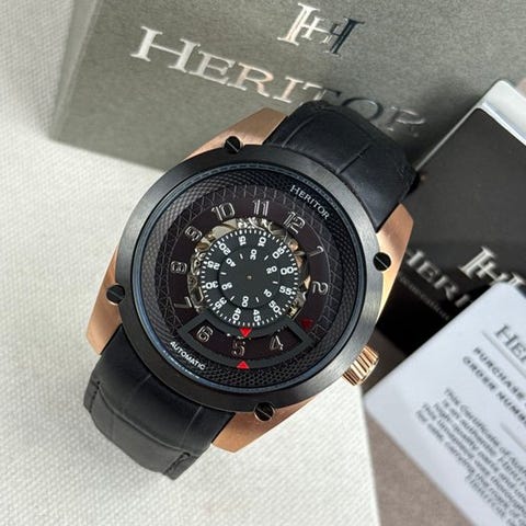 Upea herran rannekello Heritorilta Daniels-sarjasta. Viite numero HERHR7407. Kello toimii automaattisen koneiston avulla, joka on näkyvissä kellon takapuolella. Varustettu erittäin epätavallisella aikaesityksellä, jossa aika näytetään eri suuntiin osoittavilla nuolilla, ulkoreunassa tunti ja sisäpuolella minuutit ja sekunnit. Kellon lukeminen on helppoa kontrastin ansiosta, jossa musta tausta yhdistyy valkoisiin ja värillisiin yksityiskohtiin.