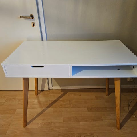 Hyvässä kunnossa oleva työpöytä. Pinnalla näkyy pientä käytön jälkeä kuten 3. kuvasta näkyy. Alunperin Jyskistä.
