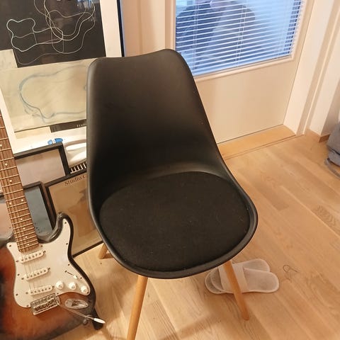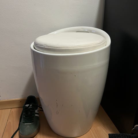 Valkoinen tekonahkapäällysteinen tuoli. Tekonahka alkanut halkeilemaan, mutta rungoltaan tuoli on ehjä. Toimitti itselläni onnistuneesti ompelupöydän tuolin virkaa viltti selkänojan päällä.