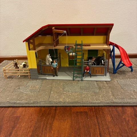 Suuri Schleichtalli, johon mukaan ikkunalaudan kukkateline kukkineen, juottoautomaatit, ruokinta- ja varustetelineet sekä heiniä ruokintatelineissä. Kaikki osat ovat ehjiä ja hyvässä kunnossa.