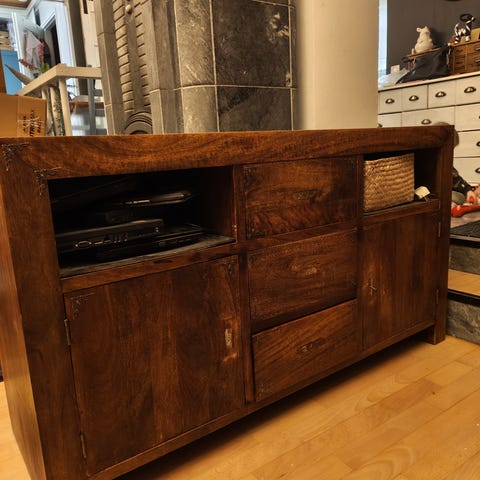 Musta/ruskea tv taso, ollut lastenhuoneessa joten kaikenlaista jälkeä löytyy. Nouto Petäikkölä. Eläimetön ja savuton koti.