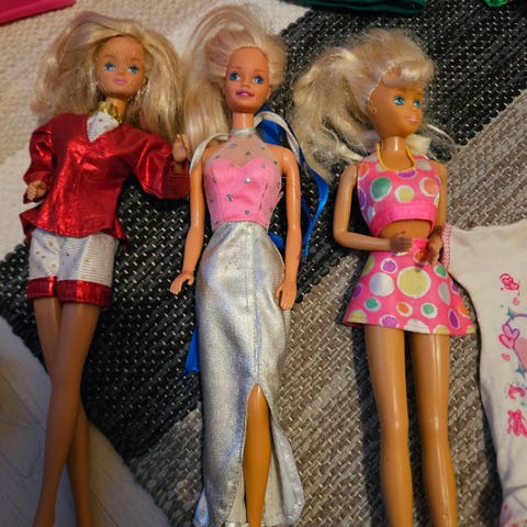 Viisi barbia, erinäisiä vaatteita ja monenlaisia tarvikkeita (myös koira kantokopassa ja sen tarvikkeet).
