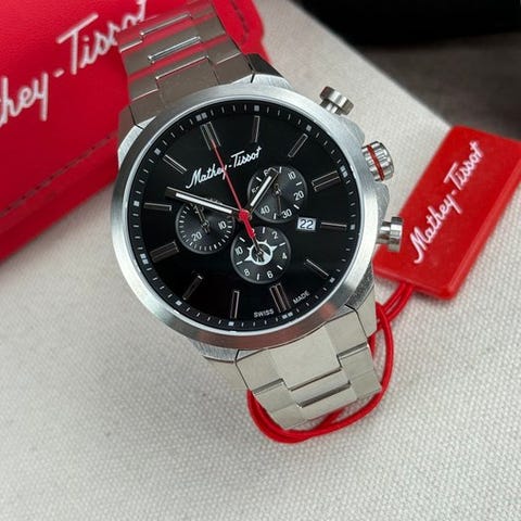 Kaunis miestenkello Mathey Tissotilta, malli H411CHALMB. Kvartsikoneistolla varustetussa kellossa on päivämääränäyttö kello neljän kohdalla ja kronografitoiminto. Musta tausta, siniset aputaulut ja hopeiset yksityiskohdat tekevät kellosta helppolukuisen. Yhteensopivan värinen nahkaranneke lisää tyylikkään ilmeen.