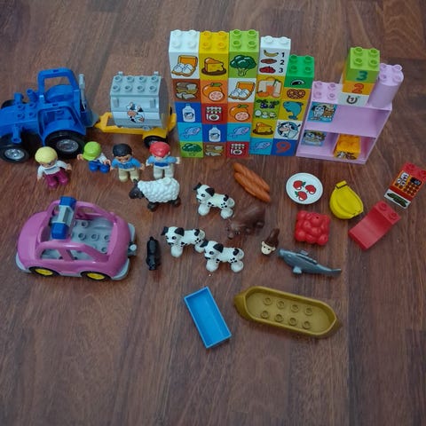 Näissä Duploissa on mukana ainakin eläintarha, koti kaikkine kalusteineen, paloasema, maatilajuttuja ja paljon ukkoja ja muuta.