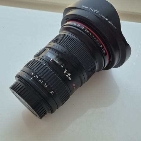 Canon 16-35mm objektiivi laajakulmazoom-ominaisuudella. Sopii erilaisiin valokuvaustarkoituksiin ja on yhteensopiva Canon-kameroiden kanssa. Objektiivia on käytetty alle 200 kuvan ottamiseen.