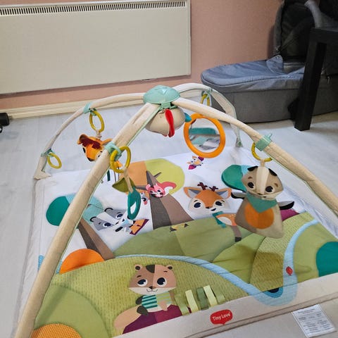 Tiny Love -leikkimatto on hyvässä kunnossa, puhdas ja virheetön sekä hajuton. Ongelmana on rikkinäinen soittorasia, joka voidaan luultavasti korjata. Matto on ostettu uutena kaupasta 70 eurolla.