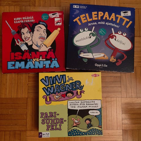 Tammi/halma/mylly, ravipeli ja palapeli. Ei tietoa onko kaikki osat tallella. Menossa roskiin jos ei jollekin kelpaa.