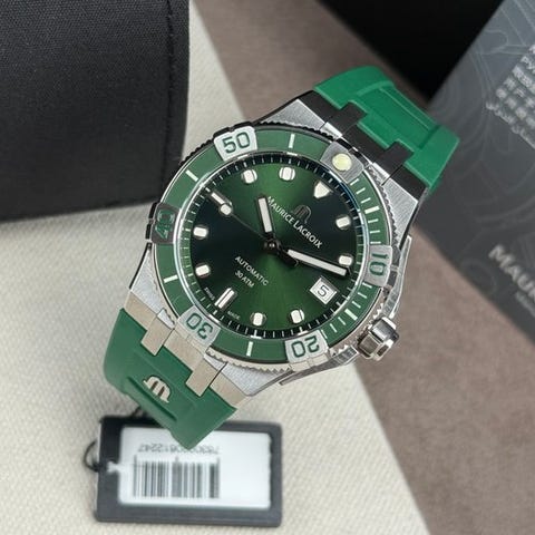 Upea herrashuonekello Maurice Lacroixin Aikon #Tide -sarjasta, referenssinumerolla AI2008-70070-300-0, Vihreä versio. Kello toimii korkealaatuisen kvartsikoneiston avulla ja siinä on päivämääränäyttö 3:n tunnin kohdalla. Kevyt kierrätetystä muovikuoresta ja kumirannekkeesta. Kello on helposti luettavissa kontrastin ansiosta taustan ja osoittimien / korostusten välillä. Kellon lasi on safiiri.