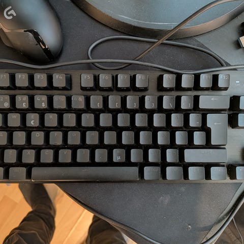 G710 Cherry MX-Blue mekaaninen näppäimistö testattu toimii täydellisesti A-näppäin hieman kulumaa