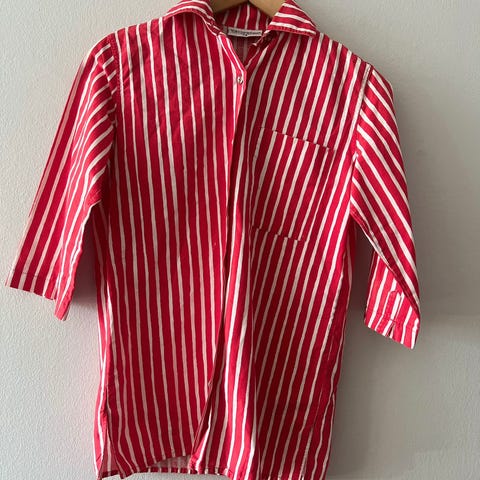 Rakkaudella (= paljon) pidetty naisten/nuorison kokoa oleva Maripaita. Punainen -oranssi -sävyissä oleva täysin ehjä raitapaita. Kova käyttö on haalistanut väriä paikoin (kuva). Hopeanväriset napit ja sivuhalkiot. Rintatasku. Mitat kuvissa.