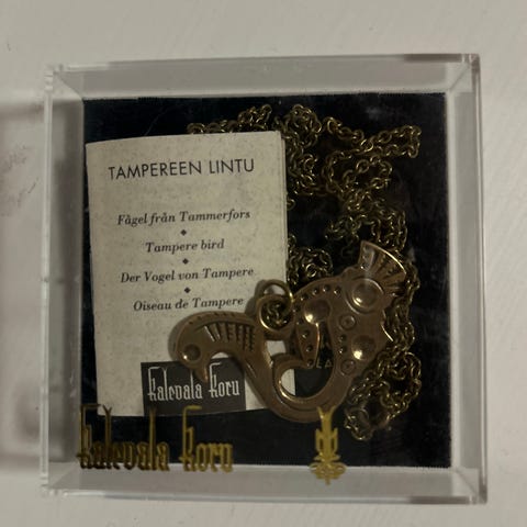 Käytössä ollut Kalevalan pronssinen pieni Tampereen lintu-kaulakoru. Ketjun pituus n. 60 cm. Rasiaa ei ole. Pakettiautomaattilähetys Manner-Suomeen 6 euroa, josta saa lähetyksen seurantanumeron. Nouto Kuopiosta keskustasta. Jos ostat kolme (3) myyntikohdettani, maksan pakettiautomaattilähetyksen Manner-Suomeen.