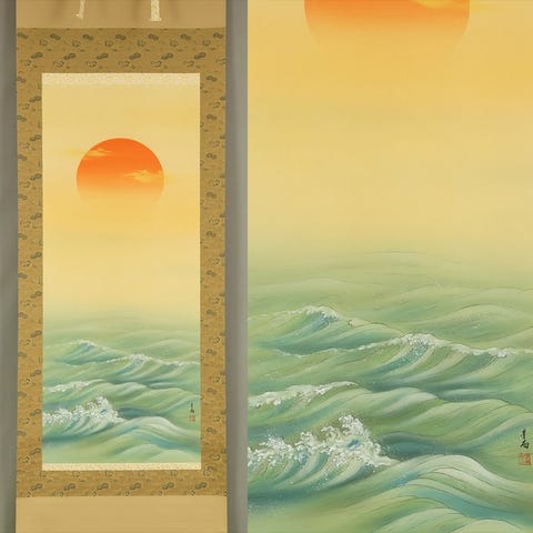 Tämä Nanreilta peräisin oleva ripustettava scroll esittää elegantin näkymän Horain vuorelle (Penglain vuorelle), ikoniselle kuolemattomuuden saarelle Itä-Aasian ajattelussa. Pehmeän usvan läpi kohoava maisema avautuu pagodalla, mänty- ja luumupuille, lentävillä haikaroilla ja hohtavalla nousevalla auringolla, kaikki harmonisesti järjestettynä symboloimaan pitkäikäisyyttä, uudistumista ja onnea. Taidokkaasti toteutettu hienovaraisella siveltimenkäytöllä ja lempeän tasapainoisella värityksellä, teos heijastaa klassista sansui-sensibiliteettiä säilyttäen samalla rauhallisen, runollisen tunnelman, joka soveltuu vuodenaikojen tai ympäri vuoden esittelyyn. Teoksessa on taiteilijan allekirjoitus ja leima 'Nanrei', ja siihen liittyy alkuperäinen tomobako, mikä lisää sen eheyttä ja esittelyarvoa.