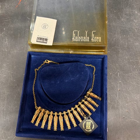 Käytössä ollut Kalevalan pronssinen Nukkekääty-kaulakoru. Käädyn kokonaispituus n. 50 cm. Rasiaa ei ole. Pakettiautomaattilähetys Manner-Suomeen 6 euroa, josta saa lähetyksen seurantanumeron. Nouto Kuopiosta keskustasta. Jos ostat kolme (3) myyntikohdettani, maksan pakettiautomaattilähetyksen Manner-Suomeen.
