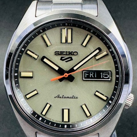 Kellotaulu: oliivinvihreä taulu hopea-/valkoisilla merkinnöillä ja osoittimilla.