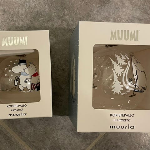 Lasipallot esimerkiksi kasveille tai valoille. Muumikuviot molemmissa. Kaksi palloa yhteensä 10€