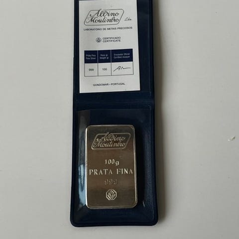 100 grammaa - hopea .999 - Albino Moutinho - Sertifikaatin kanssa