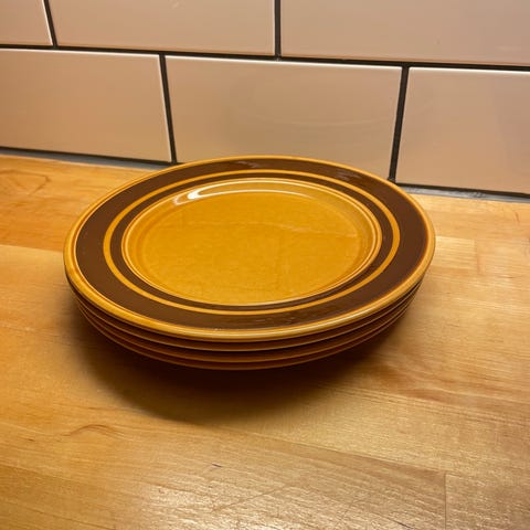Lautasissa on ruskea väri ja koristeellinen kuviointi reunoilla. Pinnassa pientä kulumaa.