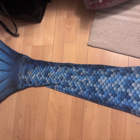 Lasten monivärinen merenneidon pyrstö ja monofin, koko 8, 120-130cm. Nouto Kauniainen tai Helsingin keskusta sovitusti. Merkki Vesikaste.