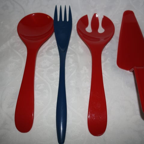 Mustaa muovia ja ruostumatonta terästä olevat ruokailuvälineet. Kaikkia 6 kpl.