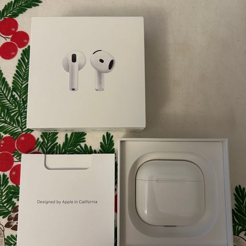 tästä pukinkonttiin käyttämättömät AirPods 4 kuulokkeet. Takuukuitti tulee mukaan. Ostettu Telialta 1.12.25