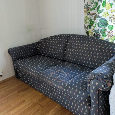 Annetaan kohtalaisessa kunnossa oleva harmaa vuodesohva divaanilla. Divaaniosassa säilytystilaa. Sohva on jo vanha, mutta edelleen käyttökuntoinen. Kaipaa pesua. Tyynyosissa irroitettavat päälliset.