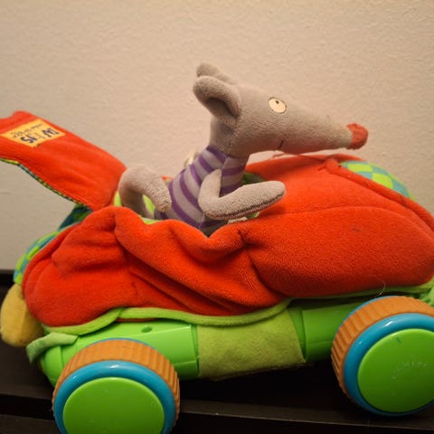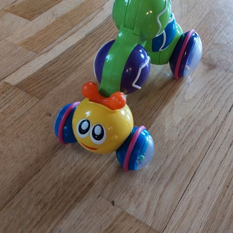 Myydään rullaava toukka vauvojen lelu. Kun selästä painaa, toukka lähtee rullaamaan. Ehjä. Käytön jälkiä (naarmuja).
