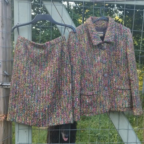 Nyt Jouluun tai vaikka uuteenvuoteen upea elegantti ja hienostunut jakkupuku Ranskasta. Väri on kaunis keltainen ja koko on S/M. Pukuun kuuluu jakku ja hame.