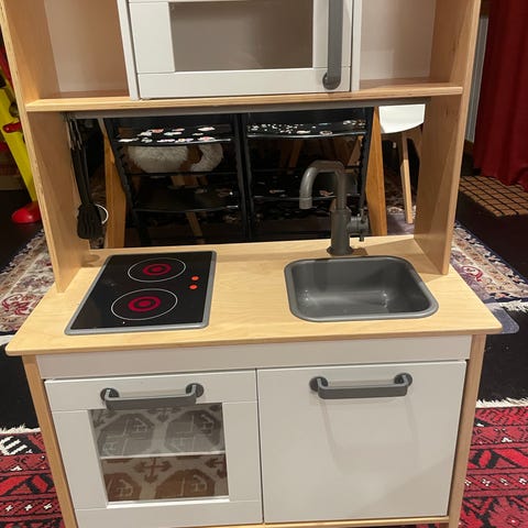 Ehjä leikkikeittiö, käytön jälkä löytyy. Koko 90x60x30 (KxLxS). Mukaan saa halutessaan korillisen tarvikkeita keittiöön.