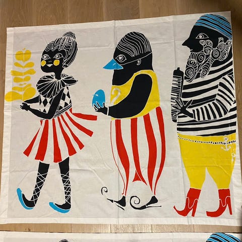 Marimekon trikooraportti 'Karkuteillä'. Koko noin 95 cm x 175cm. Kangas on ohutta ja laskeutuvaa, kenties viskoosia tai modaalia? Pohjaväri violetti. Ollut seinällä, reunoissa minikokoista pistettä. Käytetty ja käyttöön sopiva täysin. Ei uusi. Kuvattu. Second hand.